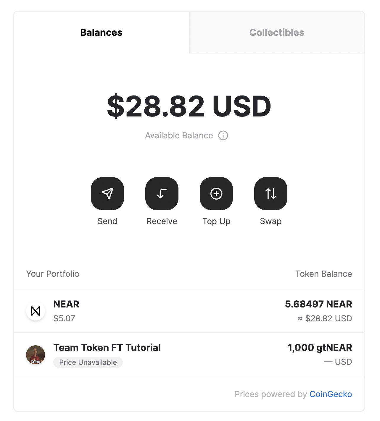 When you navigated to your balances tab, the wallet would then query all those contracts for the number of FTs you owned using the ft_balance_of function you just wrote.